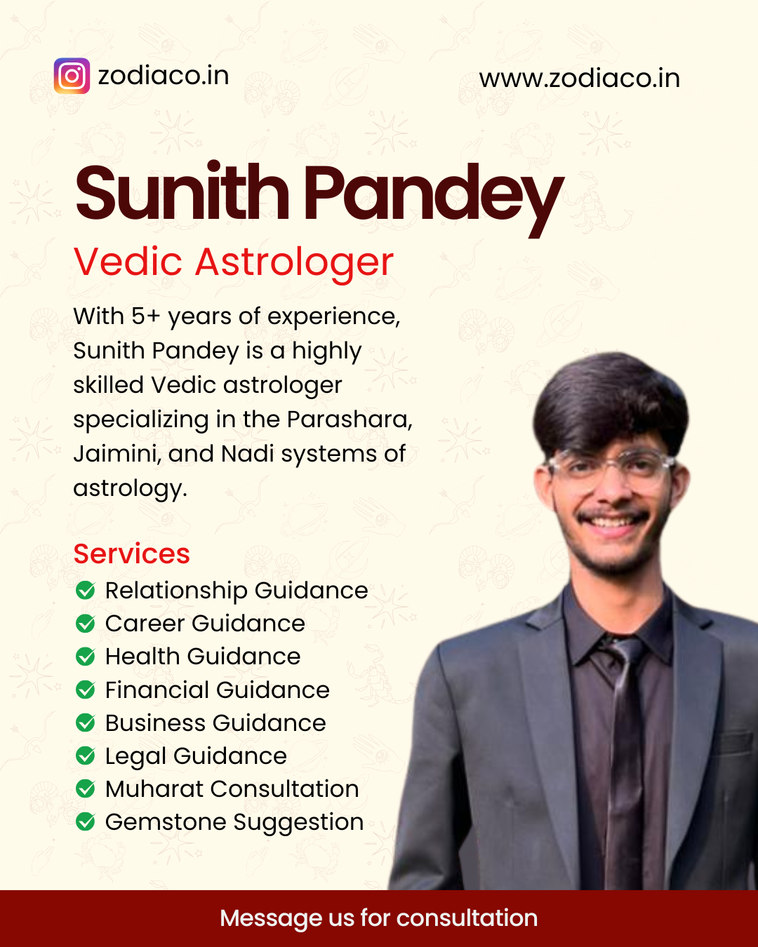 When life feels confusing and decisions start weighing heavy on your mind, you don’t just need predictions — you need clarity, direction, and confidence. This is where Sunith Pandey stands apart. With over 5+ years of hands-on experience in Vedic Astrology, Sunith combines deep traditional knowledge with a modern, practical approach. His consultations are not about fear or false promises, but about understanding your situation honestly and guiding you toward better choices. Using time-tested systems like Parashara, Jaimini, and Nadi Astrology, he helps uncover the real patterns influencing your life. Clients connect with Sunith because he listens patiently, explains clearly, and focuses on solutions that actually make sense in real life. Whether you’re struggling with relationships, feeling stuck in your career, worried about finances, health, or important legal or business matters — his guidance brings calm, reassurance, and direction. From choosing the right muhurat to receiving thoughtful gemstone suggestions, every consultation is personalized and purposeful. Fluent in both Hindi and English, Sunith ensures you feel understood, respected, and confident when the session ends. If you’re looking for clear answers, grounded advice, and genuine guidance, this is the consultation your life may be asking for.